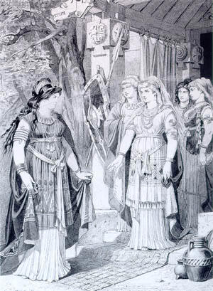 Image: "Brünhilde und Gutrune mit Gefolge", Kupferstich von C.E. Doepler, 1876.