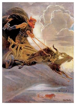 Heyo, spann den Wagen an, denn der Wind treibt Regenwolken an: Thor auf seinem Wagen, Thor auf seinem Wagen !